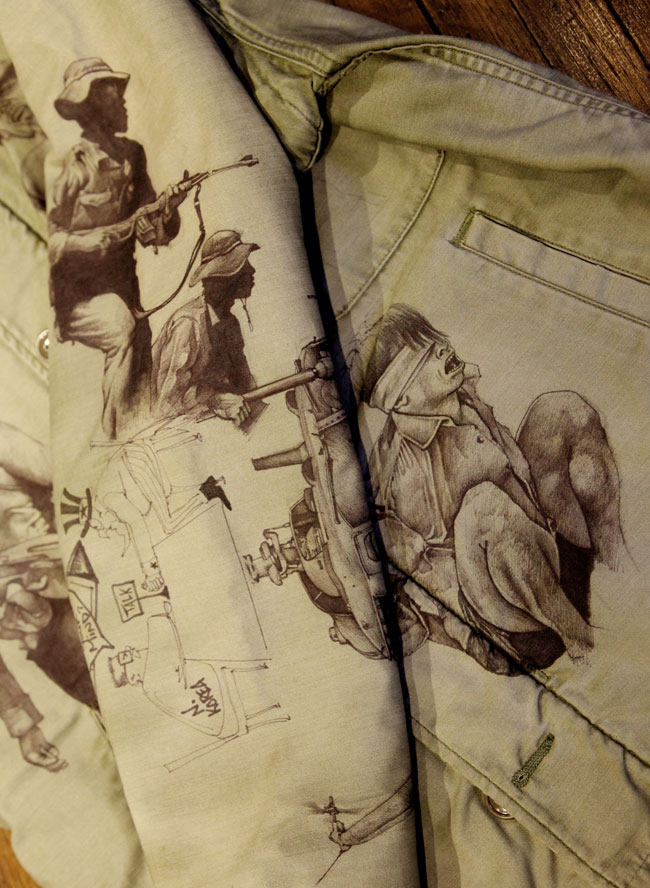In his midtown show room he lets me see a project he is working on – he is drawing freehand directly on to Vietnam issue M65 jackets that were worn by American military during the Vietnam war – beautiful and disturbing images of war – soldiers, mothers with children helicopters, guns. One of the jackets was worn by his friend Will (below) who was in the Marines – very powerful stuff. Donwan is an artist.