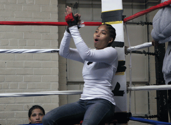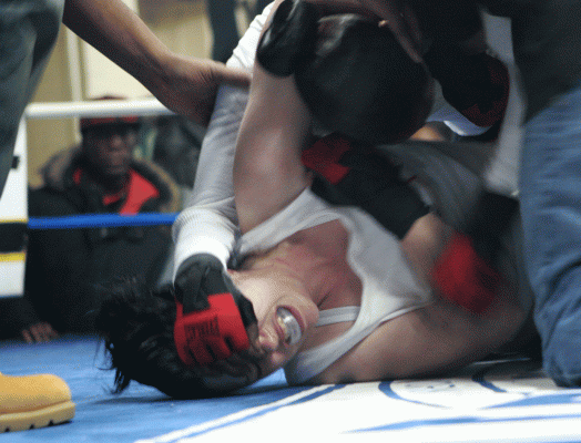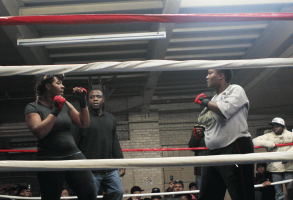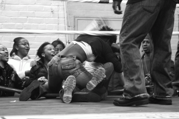 The girl fights are organized by the local ‘boys from the hood’ and publicized by word of mouth, the location is kept secret up to the day of the fight. Held in a huge windowless garage on a dark industrial street, pit bulls chained up in the back room, a boxing ring assembled in the middle of the space, security guards searching everyone as they come in. ย The place is jam packed, people of all ages, folks with babies, local youth, and the girls who are going to fight, some as young as 14 years old. There is no admission charge and the fighters are paid with proceeds from gambling on the fights.