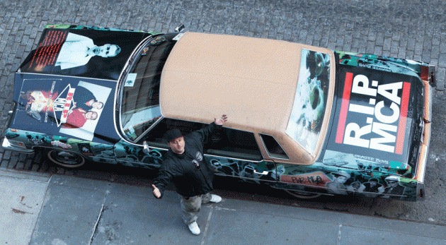 One afternoon Dave Sussman rolled up to my place in his beautiful 1976 Cadillac. The ‘BKLYNWAY/BEASTIECADDY‘ is covered in photos of the Beastie Boys, as a fan described it “ain’t enough o’s in smooooooth!” Dave created this art piece to honor the passing of MCA who sadly died in May 2012.