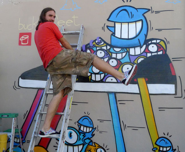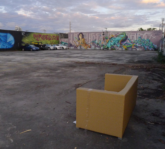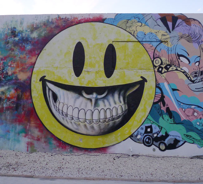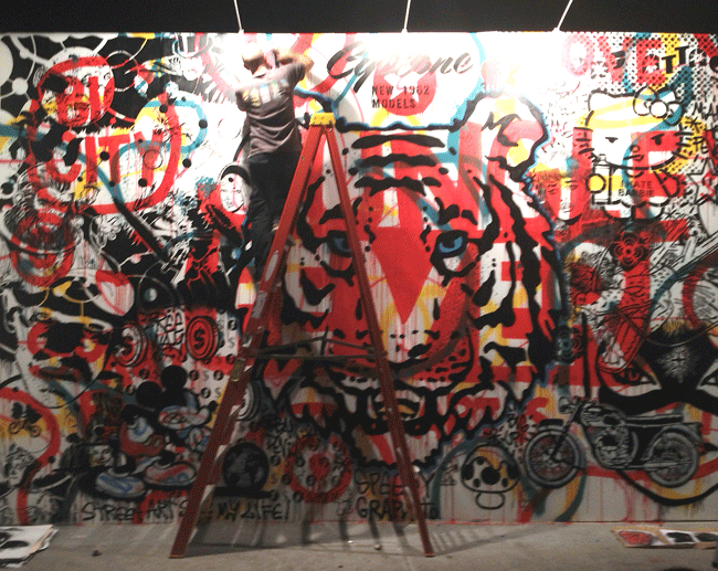 Last week I went to Art Basel in Miami. First day crossed the bridge to see the Wynwood Walls – artists from all over the world painting walls – art in progress night and day. Bumped into Mr Brain Wash (above), saw Kenny Sharf , shopped at Erni’s EVL World, finally met the original ‘Shady’ who took me to his club – in the hidden backyard is a Ron English mural and some other gems. Next day went to the ‘tents’ Context’ and ‘ Scope’, Bansky print editions of 500 selling for $10K – then some artist got in a fight and pepper sprayed the place causing a mass evacuation of the show.